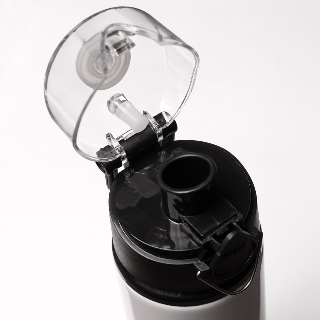 Sportovní lahev o objemu 750 ml se šroubovacím víčkem. Víčko je opatřeno praktickým očkem pro uchopení nebo zavěšení a hygienickým plastovým uzávěrem náústku, který brání rozlití nápoje